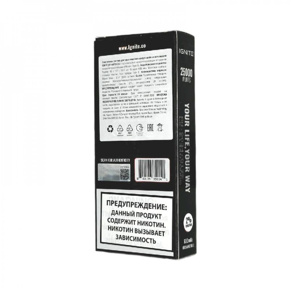 Технические характеристики Электронная сигарета Ignite V250 Black 25000 затяжек - Strawberry Banana (Клубника банан)